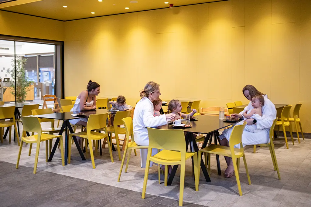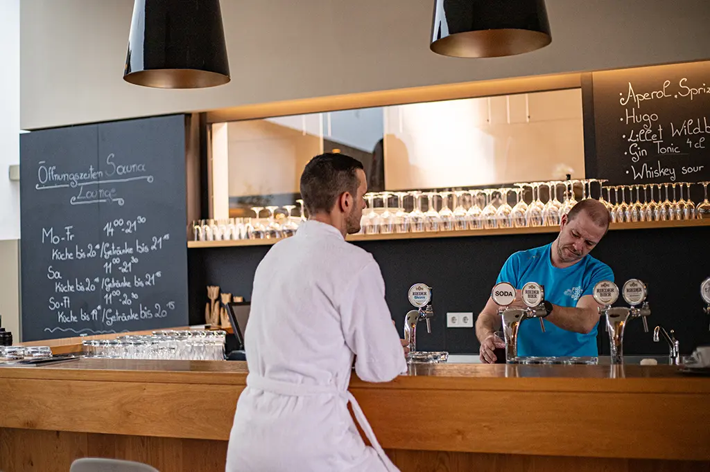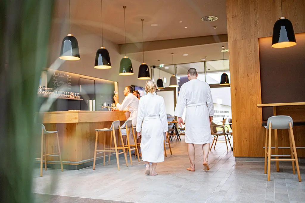 Badegäste mit Bademänteln in der Saunalounge mit Bar und Sitzmöglichkeiten