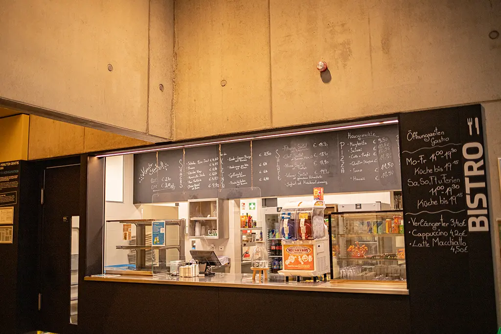 Bistro-Theke mit Getränken, Gerichten und Preisen