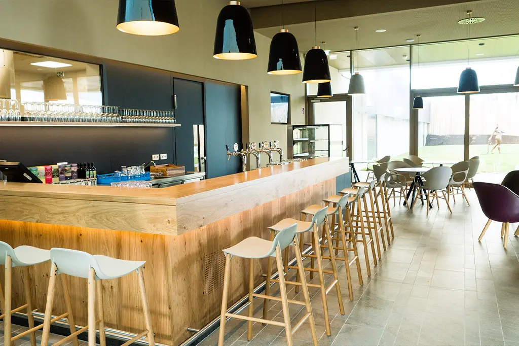 Barhocker mit dem Blick auf den Ausschank und Sitzmöglichkeiten