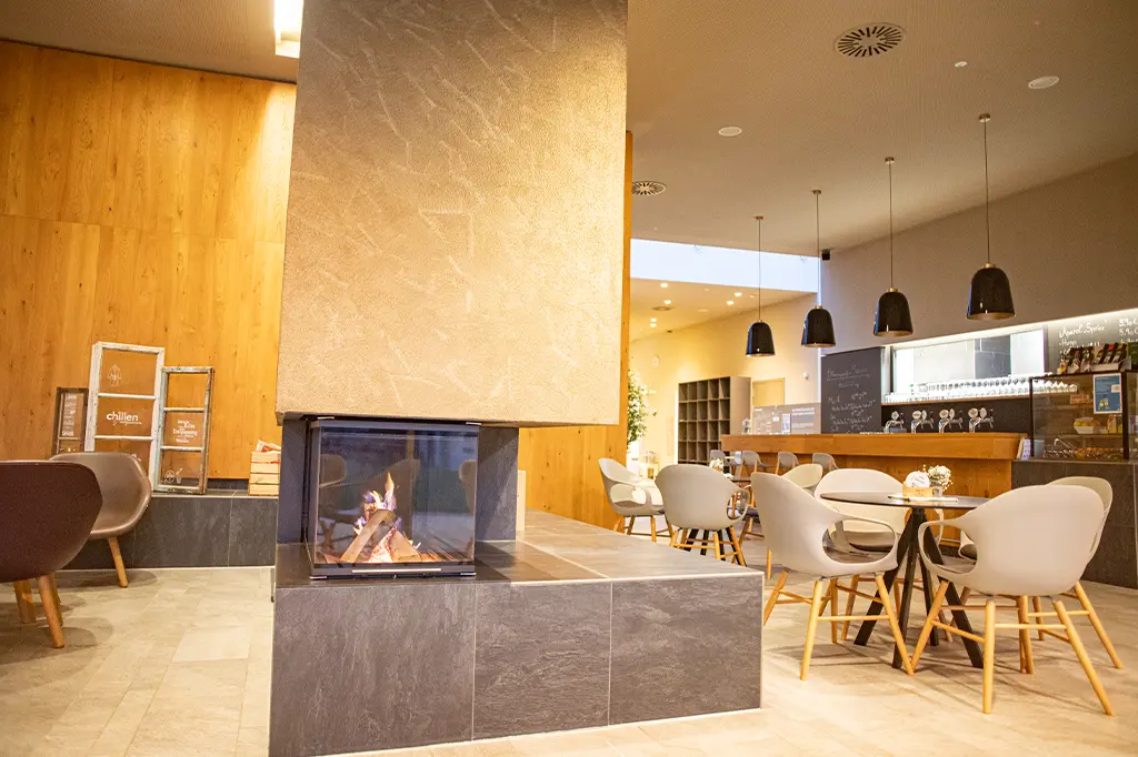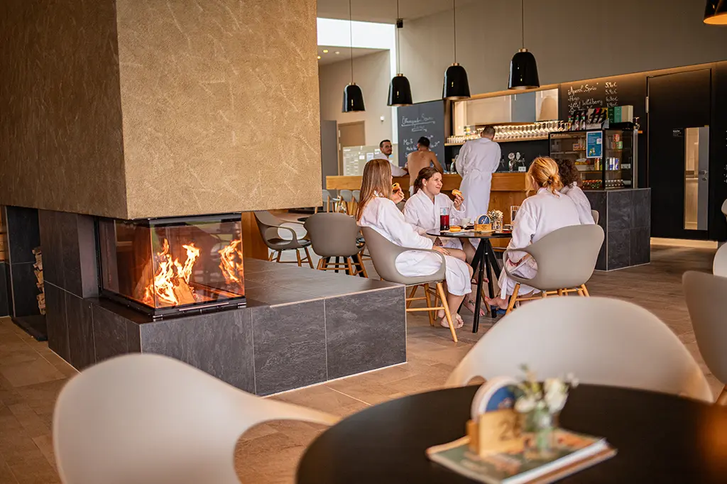 Unsere hochwertige Saunalounge lädt mit offenem Kaminfeuer, großzügiger Bar und Terrassen-Café zum Relaxen und Chillen ein.
